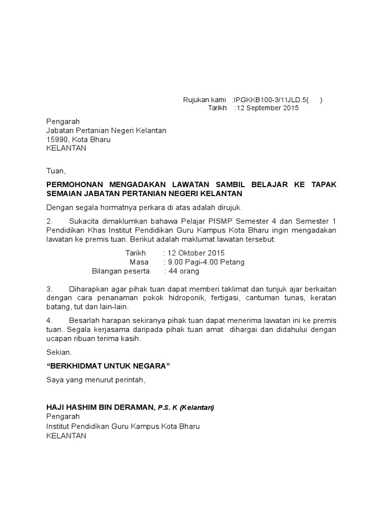 Surat Permohonan Lawatan Pas Sheet. Tawaran kenyataan sebutharga jabatan pertanian negeri kedah. Antara contoh penggunaan surat kiriman rasmi adalah untuk membuat aduanbantahancadangan membuat rayuan memohon peruntukanderma permohonan pekerjaan membuat jemputan rasmi surat menempah barangan atau tempat dan lain-lain lagi yang melibatkan tujuan rasmi.